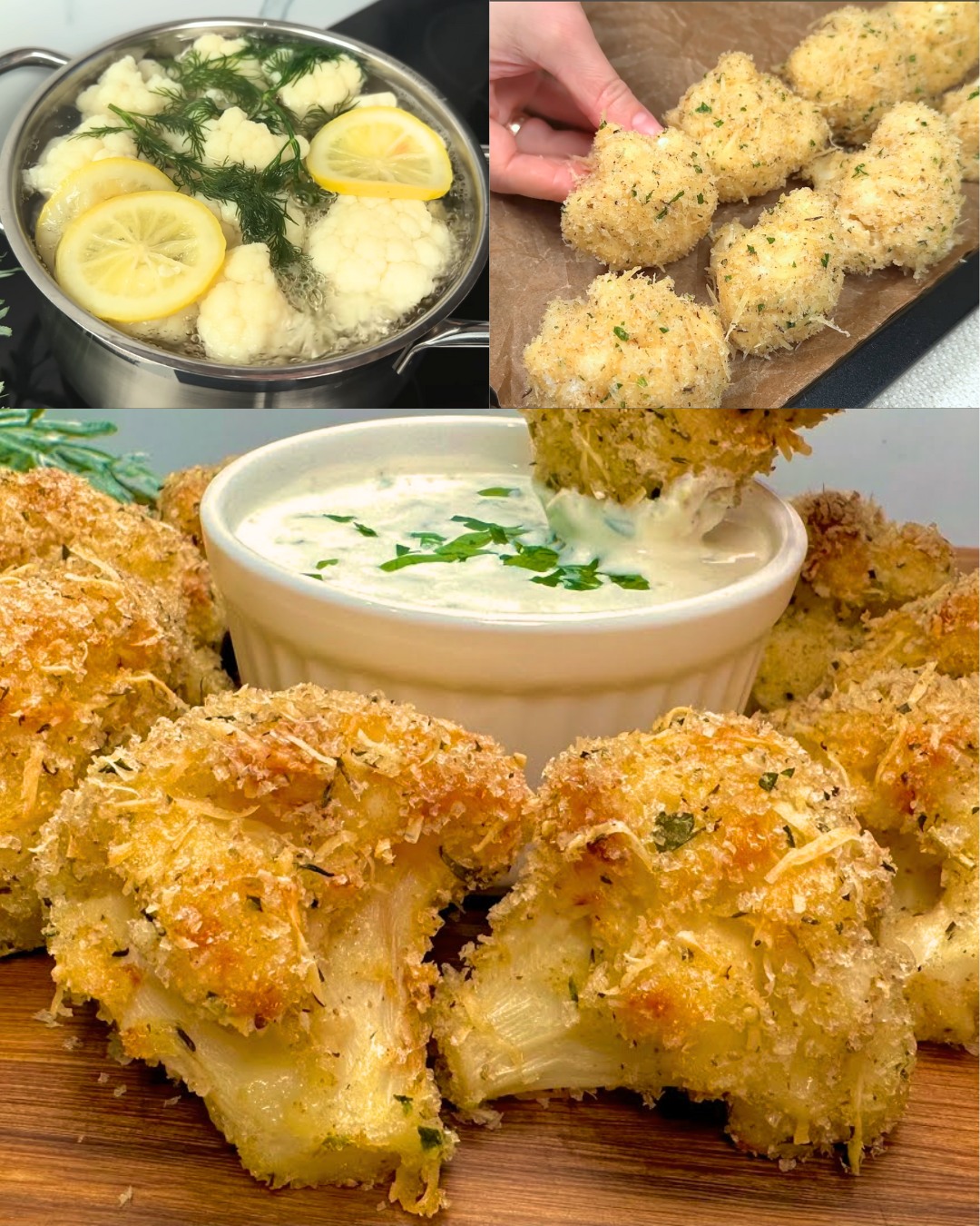 Składniki: – Na kalafior: 1 kg kalafiora 1 cytryna Koperek 150 g bułki tartej panko 1 ząbek czosnku 100 g mąki 3 jajka 5 łyżek oliwy z oliwek 1 łyżeczka ziół aromatycznych Pietruszka 100 g startego sera Sól i pieprz