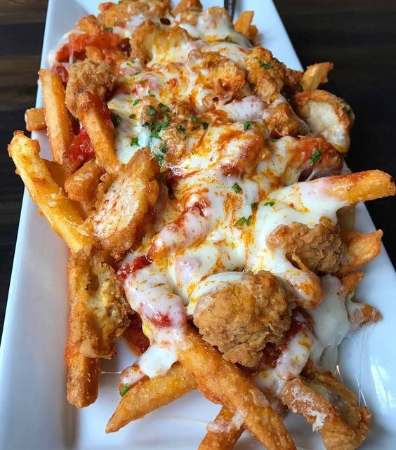 przepis na frytki z czosnkiem i parmezanem, podawane z bezkostnymi skrzydełkami kurczaka, sosem marinara i roztopioną mozzarellą
