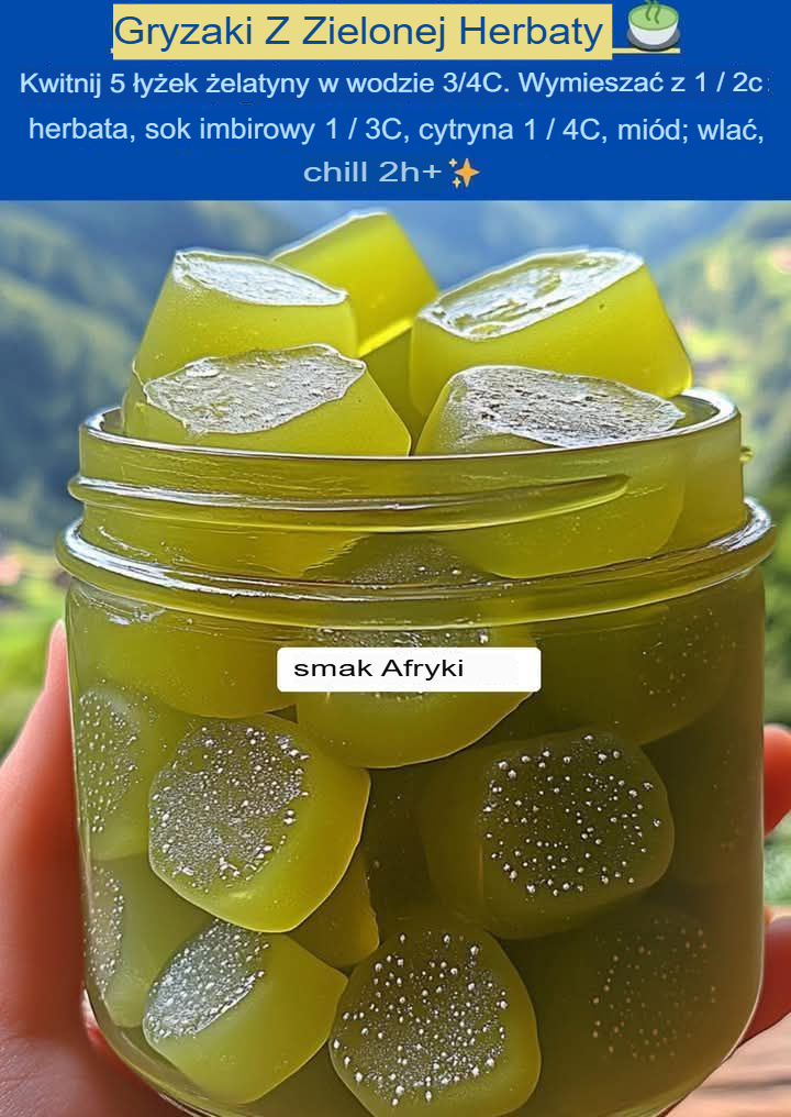 Zielona herbata, cytryna i imbir 🍵🍋✨ Składniki: – 3/4 szklanki zimnej wody 💧 – 5 łyżek żelatyny w proszku bez dodatków smakowych 🥄 – 1/2 szklanki mocnej zaparzonej zielonej herbaty (4 torebki herbaty) � – 1/3 szklanki soku imbirowego 🧡 – 1/4 szklanki świeżego soku z cytryny 🍋 – Miód do smaku (opcjonalnie) 🍯 Instrukcje: