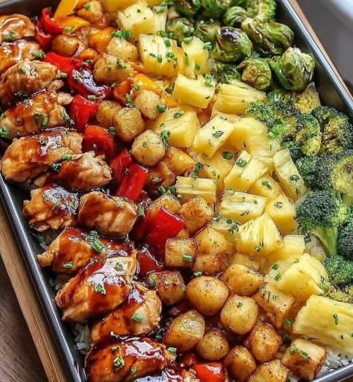 4. Ułóż kawałki ananasa, pokrojoną paprykę i czerwoną cebulę wokół kurczaka na blasze. Żywe kolory warzyw nie tylko dodadzą uroku, ale także dostarczą różnorodnych składników odżywczych.