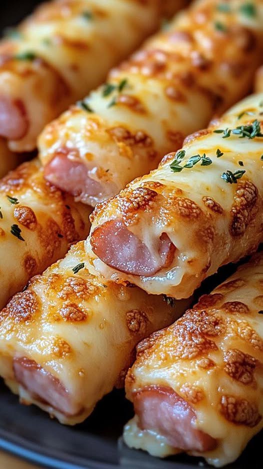 3. Ułóż roladkę w kształcie rombu i umieść na środku plaster szynki. Włóż jeden paluszek mozzarelli w środek szynki. Zawiń boki roladki w ser, a następnie zwiń całą roladkę w kształt roladki. Ułóż na blasze do pieczenia szwem do dołu.