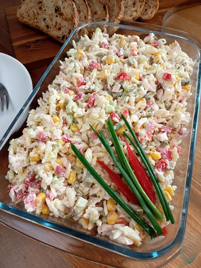Tak smaczna, że robię ją na okrągło! Idealna jako posiłek na co dzień, jak i jako poczęstunek dla gości. Szybka w przygotowaniu, w zasadzie zanim ugotuje się makaron, mamy już przygotowane resztę składników. Wystarczy wymieszać i można zajadać. Nam ta sałatka bardzo smakuje 😊. Składniki: