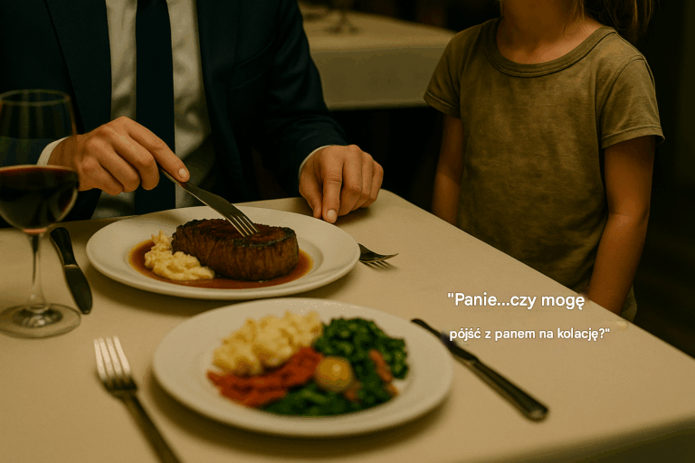 Mężczyzna w granatowym garniturze, który właśnie miał ugryźć pierwszy kęs sezonowanego antrykotu, zamarł. Powoli odwrócił się w stronę źródła: małej dziewczynki z potarganymi włosami, brudnymi trampkami i oczami emanującymi zarówno nadzieją, jak i głodem. Nikt w pokoju nie mógł przewidzieć, że tak proste pytanie zmieni ich życie na zawsze.