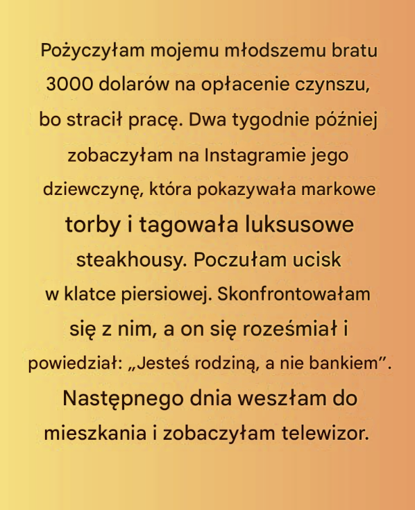 Kiedy Darren stracił pracę, nie zastanawiałem się ani chwili. Był moim młodszym bratem – przelałem mu 3000 dolarów, żeby pomógł opłacić czynsz, zakupy i zyskać trochę czasu. Tak się robi dla rodziny.