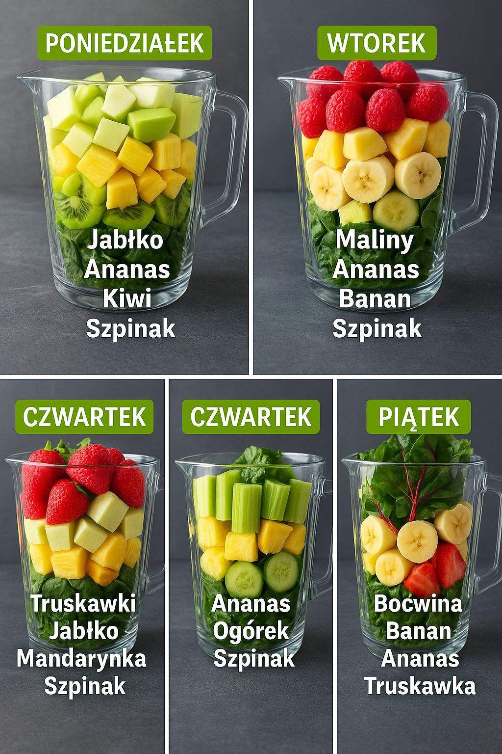 Przygotowaliśmy dla Ciebie plan na cały tydzień, dzięki któremu każdego dnia możesz spróbować innego, kolorowego i pełnego witamin smoothie. Każdy z nich zawiera zielone liście (szpinak lub boćwinę) jako bazę oraz różne owoce i warzywa – dla smaku, energii i zdrowia.