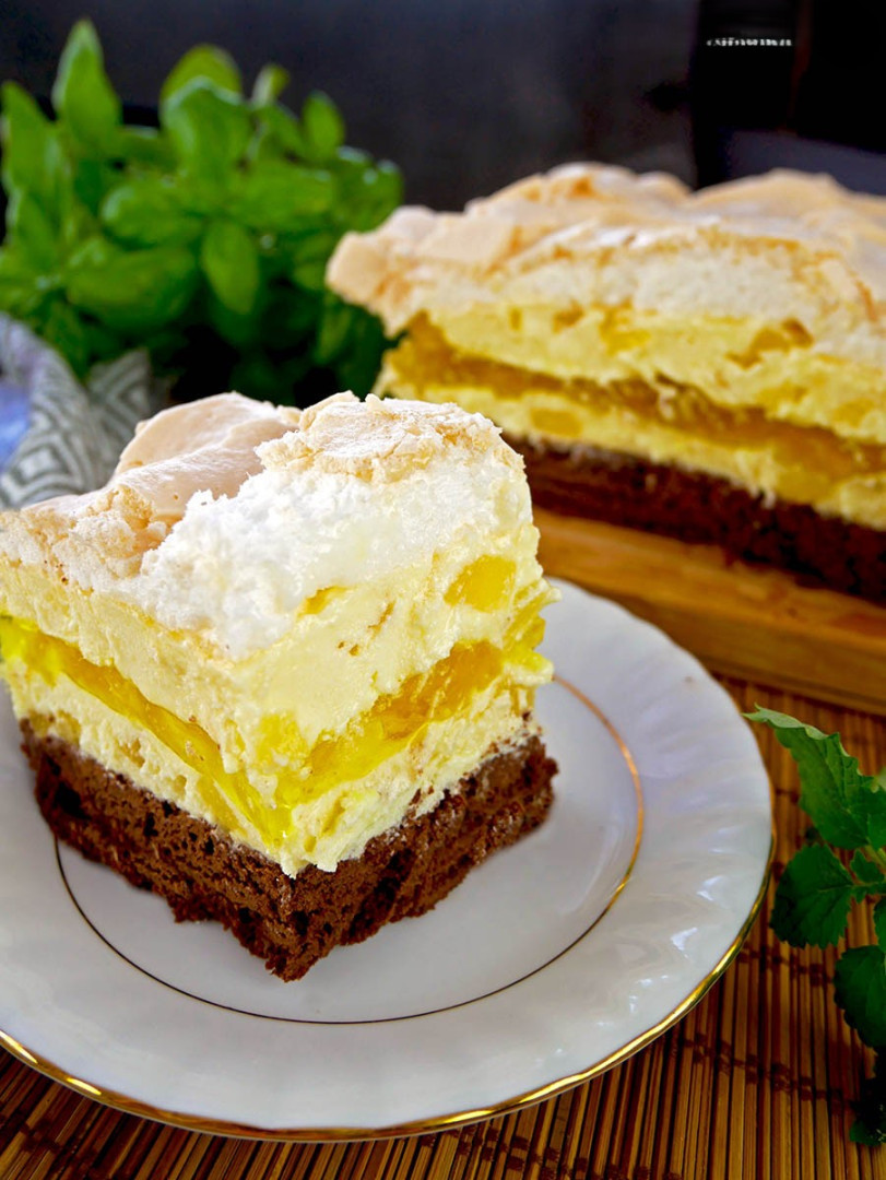 Ciasto Paź Królowej składające się z czekoladowego spodu, masy budyniowej z ananasem, galaretki i bezy jest niezwykle efektowne i bardzo smaczne. Ciasto nie jest zbyt słodkie ani ciężkie, ale za to orzeźwiające i apetyczne. Wszystkie smaki wspaniale się ze sobą łączą, tworząc udaną kompozycję.