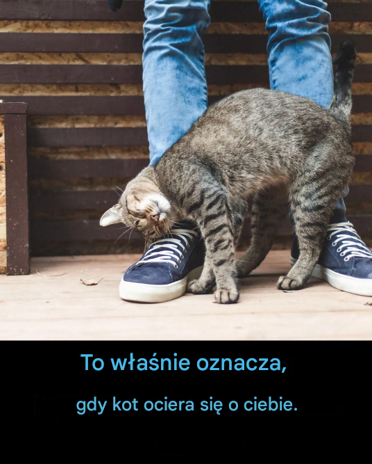 Ocieranie się o ciebie głową lub ciałem to często przyjacielskie powitanie. Koty wykorzystują to zachowanie, aby uznać cię za zaufanego towarzysza, tak jak witałyby się z innym kotem, który lubią.