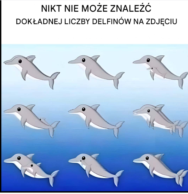 Zdjęcie pełne delfinów bawiących się w morzu… a może prawie. Ile z nich potrafisz dostrzec? Na pierwszy rzut oka wszystko wydaje się oczywiste, ale po bliższym przyjrzeniu się widać 17 delfinów, niektóre sprytnie zakamuflowane w sylwetkach innych.