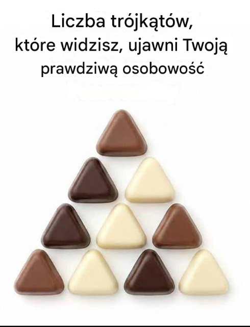 Wyzwanie trójkątów: Sprawdź swoją perspektywę. Na pierwszy rzut oka wygląda to prosto: zestaw trójkątów w kolorze czekolady ułożonych w większy trójkąt. Ale pozory mogą być mylące — ta łamigłówka zmusza do zatrzymania się, obserwacji i zakwestionowania własnej percepcji. Zadanie: Policz, ile trójkątów widzisz. Bez timera, bez sztuczek — tylko twoja obserwacja. Co ujawnia twoje liczenie? 6–7 trójkątów: Koncentrujesz się na praktycznych i oczywistych kwestiach. Mocna strona: Jasność i zdecydowanie. Wyzwanie: Pamiętaj o odkrywaniu ukrytych szczegółów. 9–10 trójkątów: Masz zrównoważoną perspektywę. Mocna strona: Spostrzegawczość i elastyczność. Wyzwanie: Zaufaj swojej intuicji, nie analizując jej zbyt wiele. 12+ trójkątów: Jesteś analityczny i skupiony na szczegółach. Mocna strona: Kreatywne rozwiązywanie problemów i rozpoznawanie wzorców…