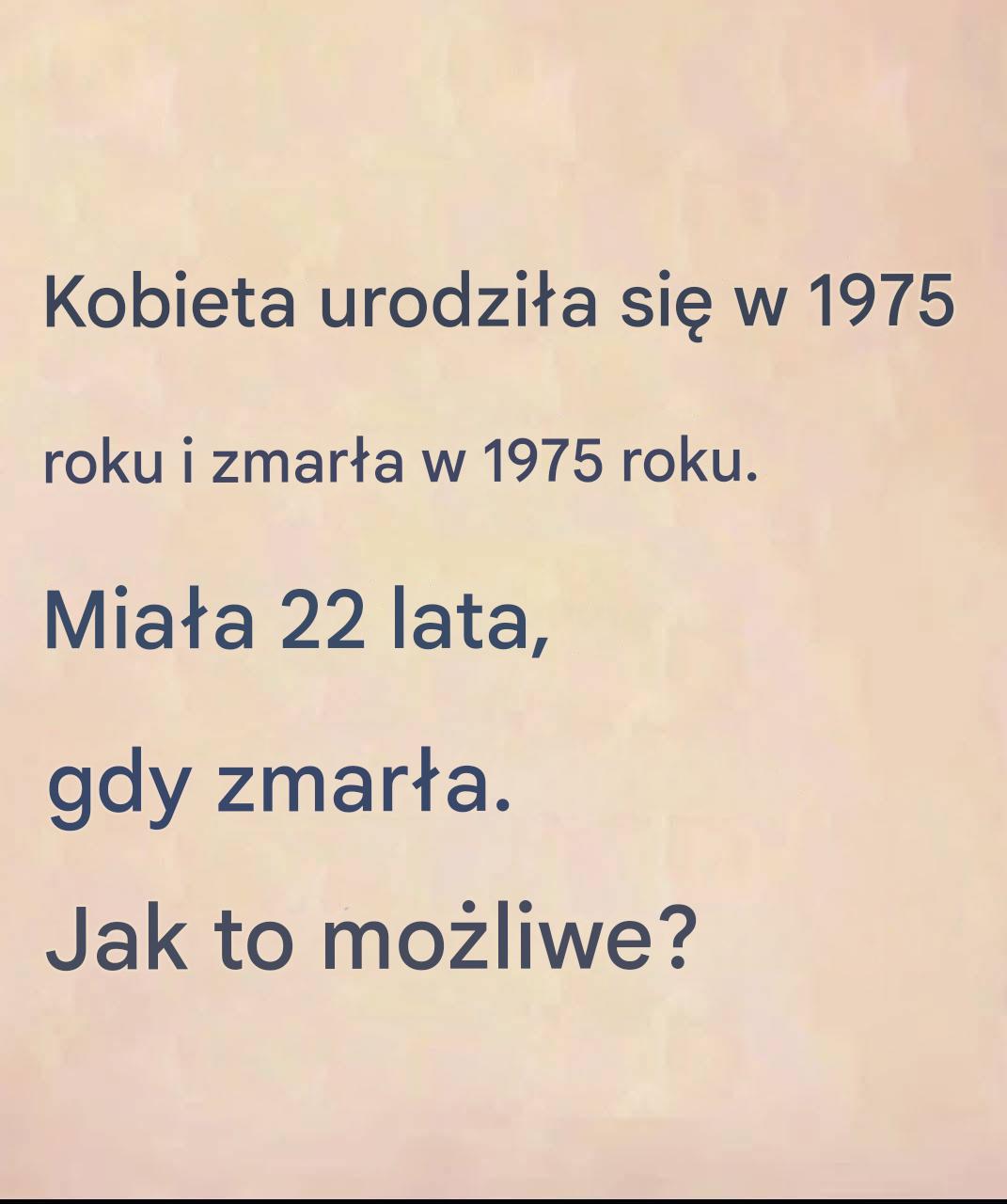 W sieci krąży zagadkowe zdanie: „Urodzona w 1975 roku, zmarła w 1975 roku, miała 22 lata”. Absurd? Nie jestem pewien… Odkryj, jak ta cyfrowa iluzja optyczna igra z naszym umysłem i dlaczego rozwiązanie jest sprytniejsze, niż się wydaje.