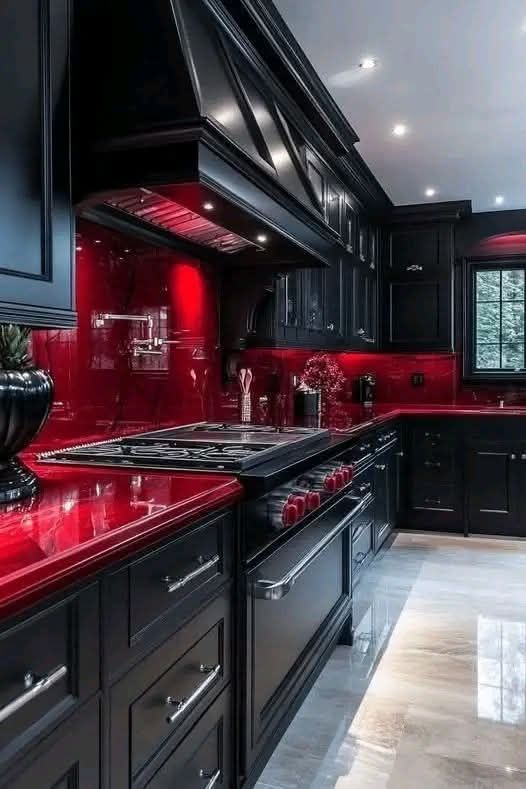 W świecie aranżacji wnętrz niewiele przestrzeni robi tak duże wrażenie, jak dobrze zaprojektowana kuchnia. Kuchnia pokazana powyżej to spektakularne połączenie nowoczesnego luksusu i odważnej kreatywności, łącząc głębokie, matowo-czarne szafki z żywymi, błyszczącymi czerwonymi powierzchniami, tworząc przestrzeń zarówno artystyczną, jak i funkcjonalną.