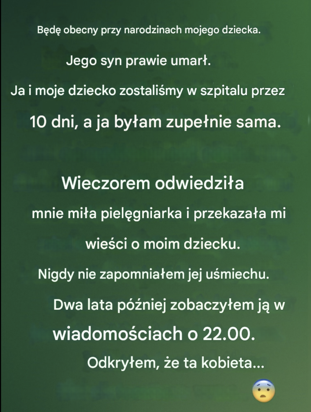 W ciągu dnia lekarze i pielęgniarki przychodzili i odchodzili, sprawdzając parametry życiowe, regulując kroplówki i dodając otuchy, zanim pobiegli do następnego pacjenta. Wszyscy byli przyjaźni, ale wszyscy byli bardzo zajęci. Jednak w nocy szpital się zmieniał. Korytarze cichły, kroki stawały się bardziej dyskretne, a świetlówki przygasały do ​​bladego blasku. W tych godzinach, gdy strach był najsilniejszy, a samotność nie do zniesienia, ktoś zapukał. Cicho. Niemal niepewnie. Pielęgniarka ostrożnie weszła, jakby nie chciała zakłócić mojego niestabilnego stanu. Miała ciepłe spojrzenie i spokojny uśmiech, który natychmiast złagodził napięcie w mojej piersi. Czasami siadała przy moim łóżku i delikatnie opowiadała mi o życiu codziennym – o pogodzie, swoim oddziale, o tym, jak czuje się mój syn. Innymi nocami siedziała tam w milczeniu i dawała mi przestrzeń, podczas gdy łzy nagle spływały mi po policzkach. Nigdy mnie nie naciskała. Nigdy nie kazała mi być silną. Nigdy nie minimalizowała mojego strachu. Słuchała, kiwała głową i po prostu pozwalała mi być sobą: załamaną, wyczerpaną i przestraszoną. Co najważniejsze, zawsze przynosiła wieści z oddziału intensywnej terapii noworodków. Drobne aktualizacje. Równomierne bicie serca. Dobre odżywianie. Nieznaczną poprawę. Każdy szczegół był jak tlen. I jakoś ta wiadomość dawała nadzieję, a nie przytłaczała. Nigdy nie poznałam jej imienia. Nigdy nie została na tyle długo, żeby zapytać. Ale w takich chwilach była jedynym wsparciem w świecie, który się rozpadł.
