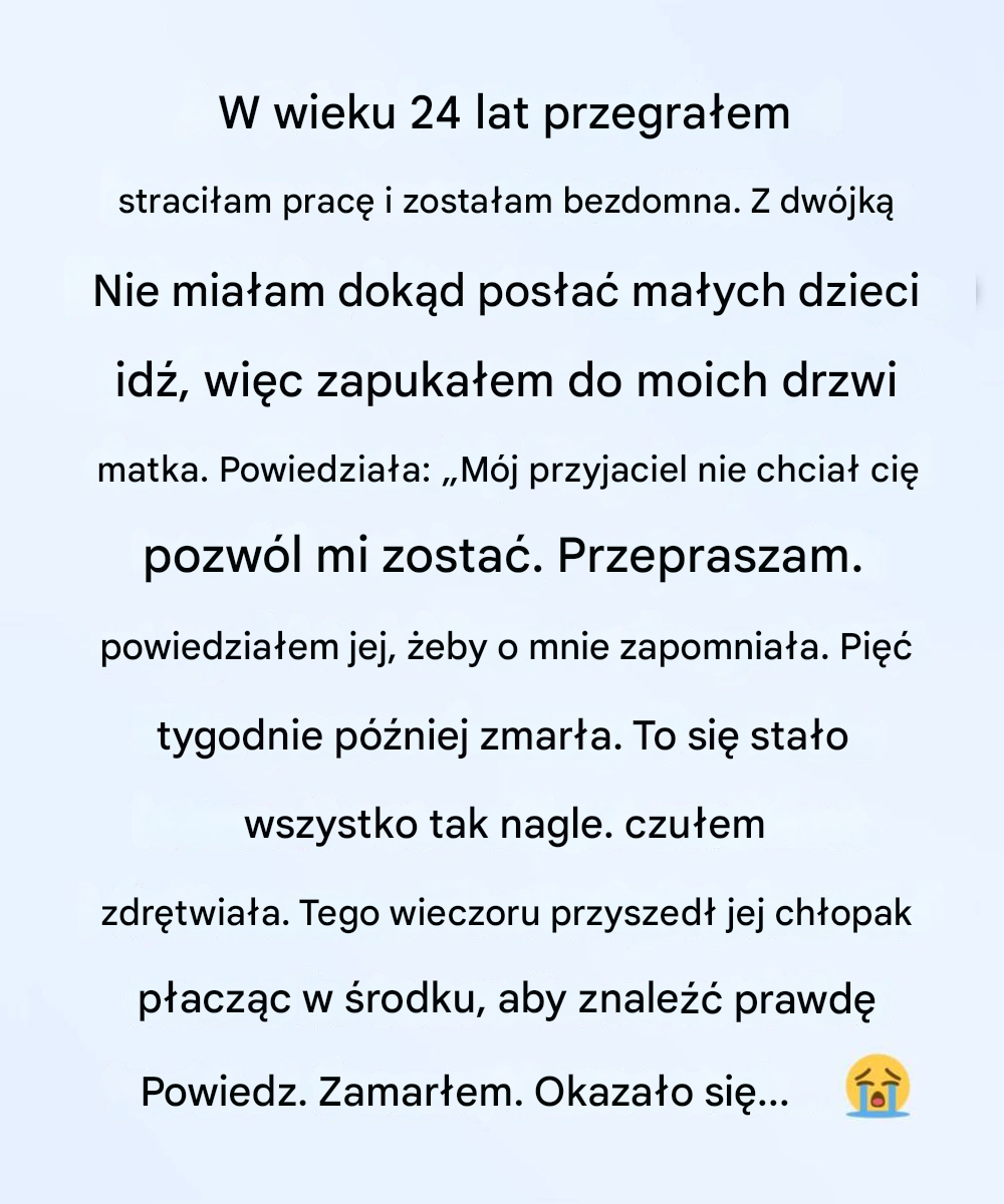 Kiedy otworzyła drzwi, wydawała się mniejsza, niż ją zapamiętałem — szczuplejsza, ramiona lekko zgarbione, oczy zmęczone, ale wciąż łagodne w ten znajomy sposób, który kiedyś sprawiał, że czułem, iż wszystko da się rozwiązać.