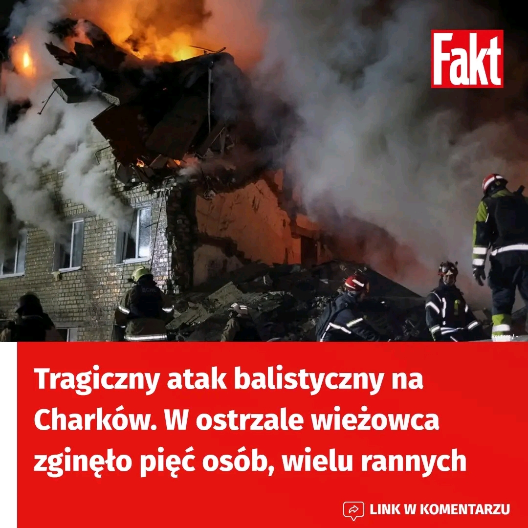 Zmasowany atak Rosji na Ukrainę. Rakiety balistyczne i drony uderzyły m.in. w Kijów, Zaporoże, Odessę, ale najtragiczniejszy w skutkach był ostrzał Charkowa. Tam pociski trafiły w wieżowiec mieszkalny. Wiadomo, że zginęło co najmniej pięć osób, a wiele zostało rannych. Trwa akcja ratunkowa.