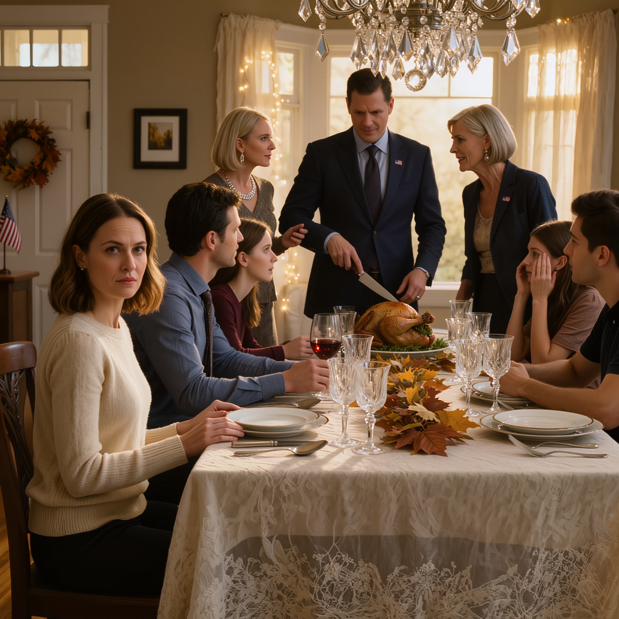 Kryształowy żyrandol nad stołem jadalnym rzucał rozproszone światło na dwadzieścia trzy nakrycia, z których każde symbolizowało członka rodziny, który zebrał się na, jak to nazywała mama, tradycyjne święto Dziękczynienia. Usiadłem