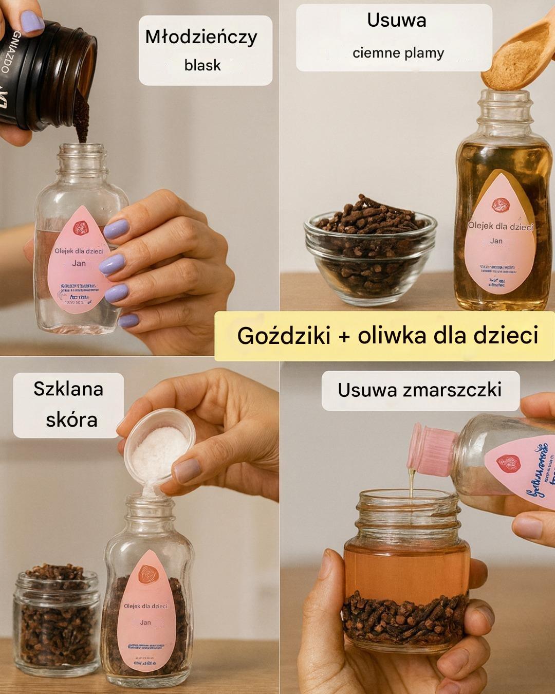 Połączenie goździków i oliwki dla dzieci – delikatnego kremu nawilżającego na bazie oleju mineralnego – tworzy interesującą kombinację. Olej mineralny działa jak okluzja, tworząc barierę zatrzymującą wilgoć, jak wskazują recenzje z takich źródeł jak Verywell Health. Może być szczególnie pomocny w przypadku suchej skóry, pomagając jej stać się gładszą i bardziej elastyczną.
